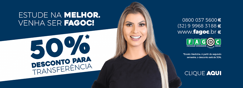 A Fagoc oferece uma condição especial para transferências. O aluno de outra instituição de ensino superior que deseja se transferir para a faculdade recebe 50% de desconto nas mensalidades do primeiro semestre.