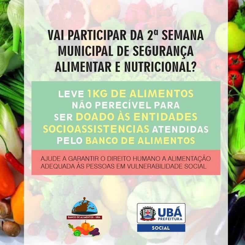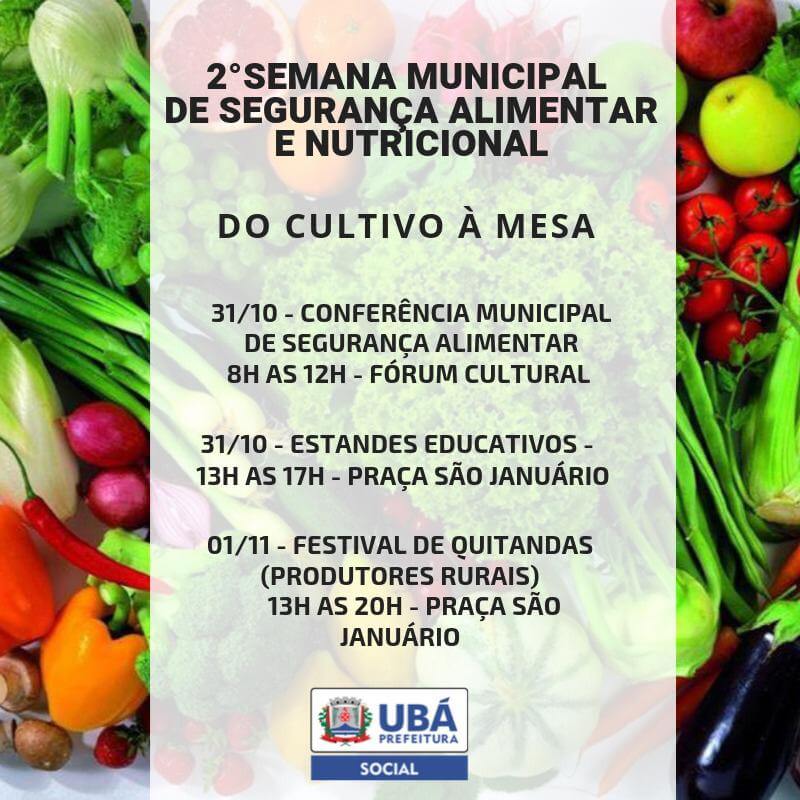 A programação da 2ª Semana Municipal de Segurança Alimentar e Nutricional segue até na véspera de feriado de finados. Na sexta-feira, acontece o 1º Festival de Quitandas de Ubá, uma iniciativa que busca a valorização da agroindústria local, com mostra e comercialização de bolos, pães, biscoitos, sucos, polpas e demais produtos da agricultura familiar. O evento acontece das 13 às 20h, com show da dupla sertaneja Guilherme e Tiago, às 18 horas.