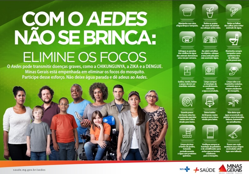 Como 80% dos focos estão nas residências, a campanha “Com o Aedes não se brinca” foi criada com o objetivo de mobilizar os cidadãos e promover as ações de prevenção e controle do vetor transmissor. Todo o material gráfico produzido para a campanha está disponível para download no site do governo. Todo conteúdo pode ser veiculado e reproduzido por toda população, desde que seja preservado e respeitado o conteúdo original e a ficha técnica. Clique aqui para acessá-lo.