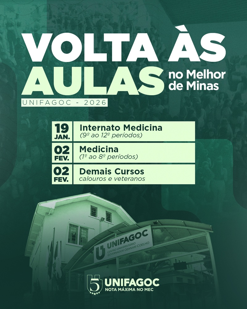 A contagem regressiva para o início do semestre letivo 2026-1 já começou no UNIFAGOC – Melhor Centro Universitário de Minas Gerais. Após o período de recesso acadêmico, calouros e veteranos voltam ao campus em datas já definidas, marcando o reencontro com a rotina acadêmica, os colegas e a vivência universitária.