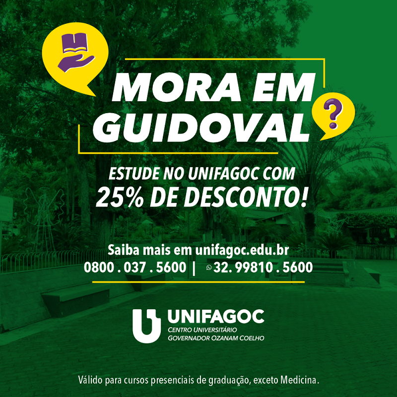 Alunos que residem na cidade de Guidoval podem ganhar 25% de desconto na matrícula e nas mensalidades nos cursos de graduação presenciais do UNIFAGOC, exceto Medicina. O benefício é válido para novas matrículas e é concedido graças a um convênio entre o Centro Universitário e a prefeitura do município supracitado.