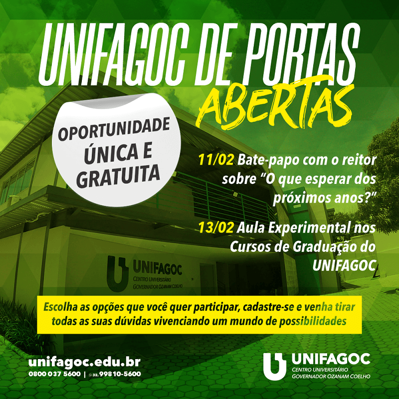 Para aqueles que ainda estão em dúvida de qual graduação escolher, o UNIFAGOC oferece a possibilidade de participar gratuitamente de um bate-papo com o reitor e de uma aula experimental de qualquer curso da instituição, exceto Medicina.