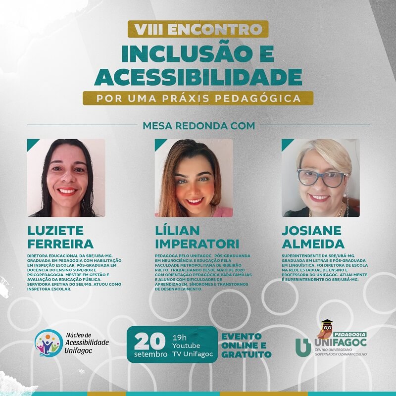 O curso de Pedagogia do UNIFAGOC, em parceria com o Núcleo de Acessibilidade, promove o VIII Encontro sobre Inclusão e Acessibilidade. A iniciativa acontecerá no dia 20 de setembro, a partir das 19h e será transmitido por meio do youtube TV UNIFAGOC. O evento é gratuito e aberto à comunidade.