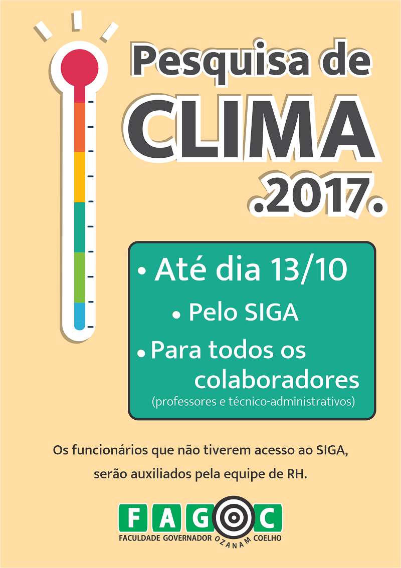 Já está disponível a pesquisa de clima 2017. Os colaboradores da Fagoc têm até o dia 13 de outubro para responder às questões via Siga. Esse é o espaço onde os colaboradores podem expor suas opiniões e sentimentos sobre a empresa de forma sigilosa.