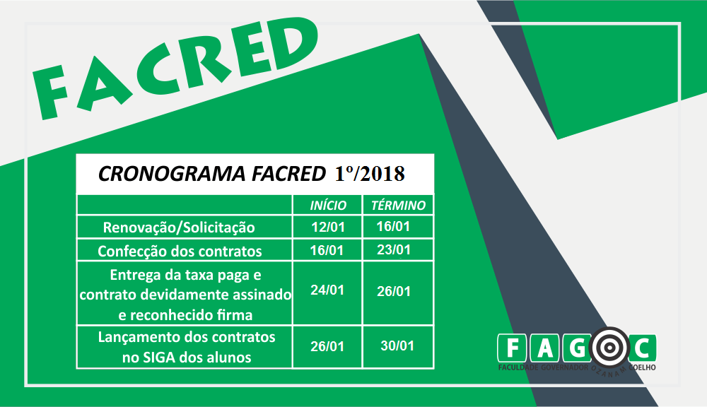 Alunos interessados em solicitar ou renovar o Facred têm até esta terça-feira (16) para requerer ou renovar o benefício para o 1º semestre de 2018. É preciso procurar a Secretaria Financeira (Sefin) da Fagoc, no horário de 8h as 19h. A taxa de semestralidade referente ao programa de parcelamento é de R$ 60.