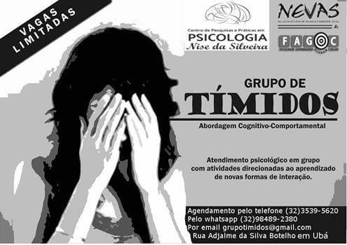 O Centro de Práticas e Pesquisa em Psicologia Nise da Silveira está começando um Grupo de Tímidos. A iniciativa vai trabalhar os principais sintomas da timidez patológica ou ansiedade social por meio da terapia comportamental em grupo. Podem participar pessoas maiores de 18 anos e que tenham disponibilidade de comparecer a encontros semanais.