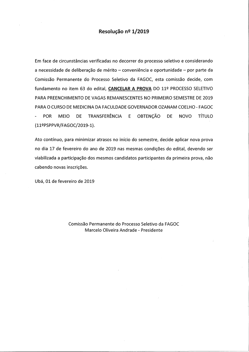 A Comissão Permanente do Processo Seletivo da Fagoc, com fundamento no item 63 do edital do 11º processo seletivo das Vagas Remanescentes de Medicina, decidiu cancelar a prova realizada no dia 27 de janeiro de 2019. Para minimizar atrasos no início do semestre, haverá nova data para realização das provas, que serão aplicadas no dia 17 de fevereiro (domingo).