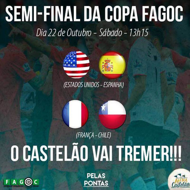 Acontece, neste sábado (22), a Semifinal da Copa Fagoc de FUT7, a partir das 13h15, na Arena Castelão. Os times participantes serão Estados Unidos, Espanha, França e Chile e as equipes são compostas por alunos dos cursos de Educação Física e Direito da Fagoc. Confira abaixo: