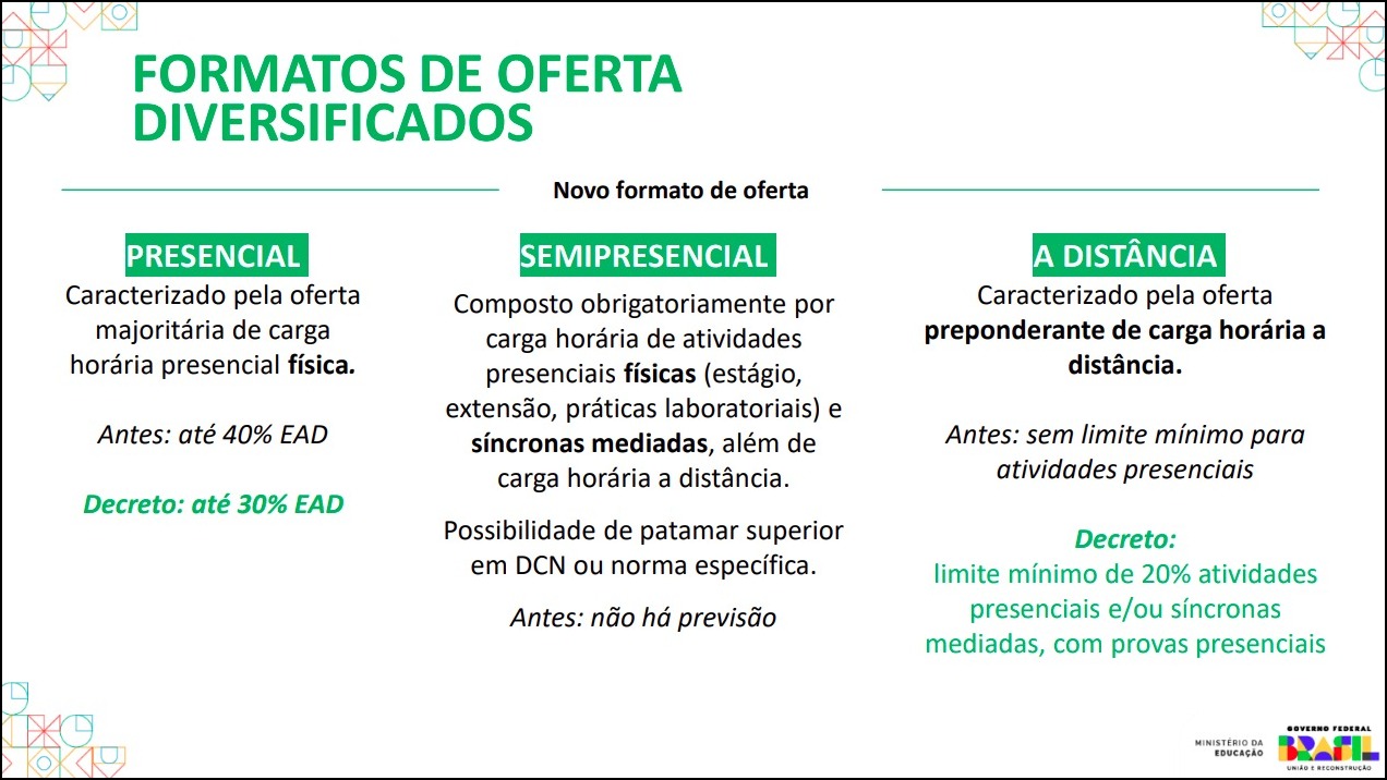 Uma das principais mudanças trazidas pelo decreto do Ministério da Educação (MEC), é a definição clara dos formatos de oferta dos cursos de graduação. O texto estabelece oficialmente a modalidade semipresencial como uma nova forma de oferta, diferenciando-a das modalidades presencial e a distância. Além disso, o decreto determina os percentuais mínimos e máximos de carga horária presencial e a distância para cada um desses formatos, o que representa importante mudança no cenário do ensino superior brasileiro.