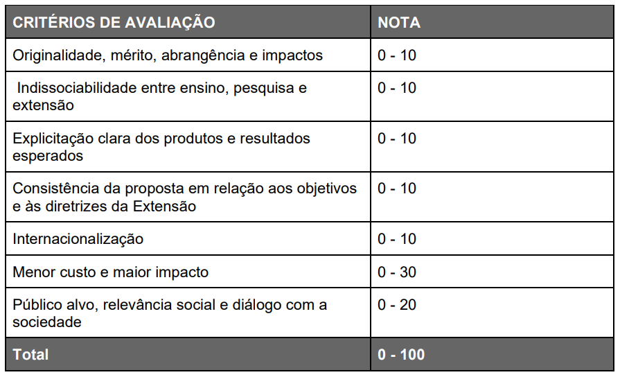 Serão selecionadas até duas propostas na Modalidade 1 e até seis propostas na modalidade 2, que serão avaliadas pela Comissão Permanente de Extensão, observando os seguintes critérios: