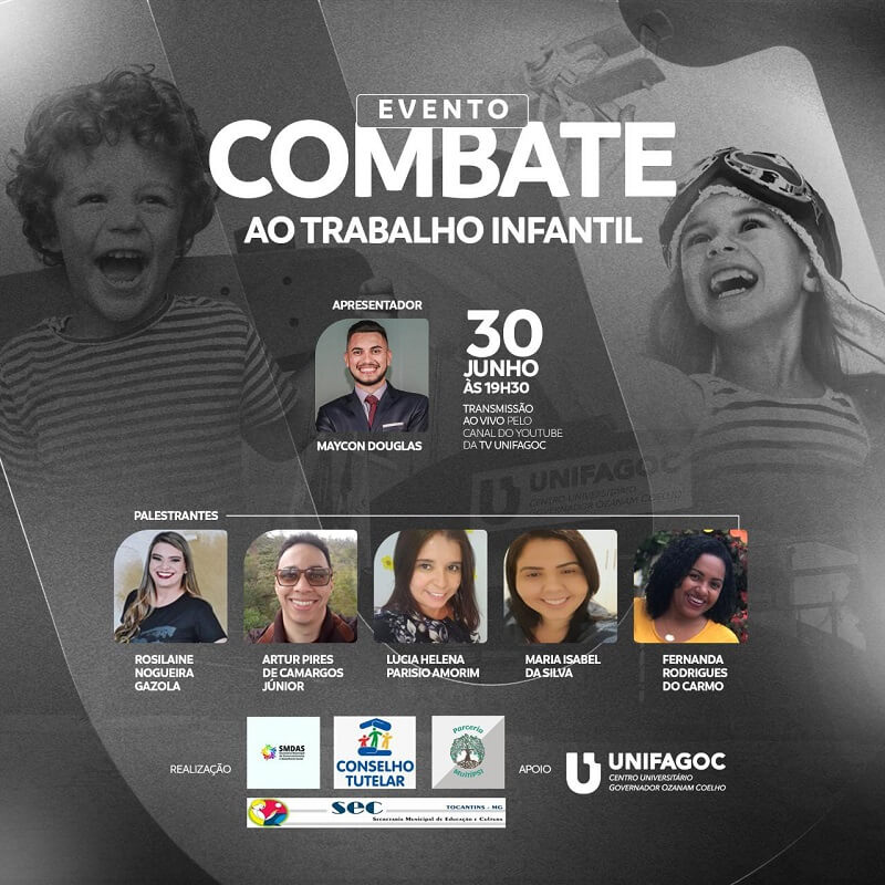 Acontece, na próxima quarta-feira (30), às 19h30, uma live no canal do YouTube da TV UNIFAGOC com o tema Combate ao Trabalho Infantil. O evento é realizado pela Secretaria da Assistência Social e Conselho Tutelar de Tocantins, Secretaria da Educação e Cultura de Tocantins e Parceria MultiPSI.