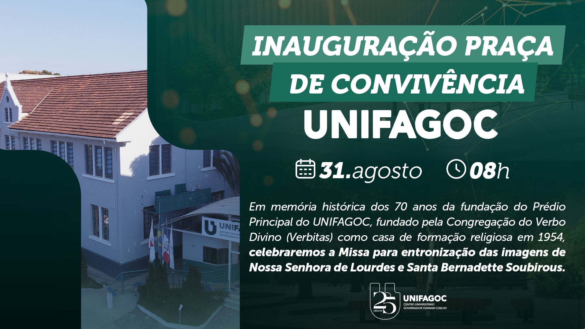 No ano de 2024, o Centro Universitário Governador Ozanam Coelho completa 25 anos e o prédio principal completa 70 anos de fundação. O espaço que abriga o campus do UNIFAGOC foi fundado pela Congregação do Verbo Divino (Verbitas), em 1954, como casa de formação religiosa, dando nome, inclusive, ao bairro Seminário. Como forma de valorização desta história, será realizada a missa para a entronização das imagens de Nossa Senhora de Lourdes e Santa Bernadete Soubirous que, durante, muitos anos existiram na gruta que abrigava o seminário.