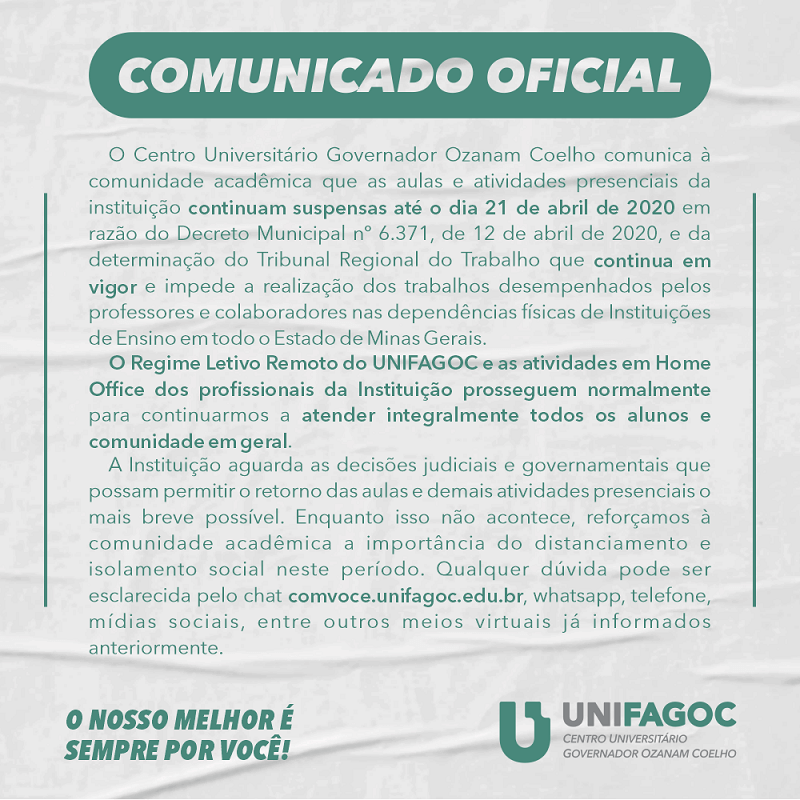 Em comunicado oficial, emitido na última segunda-feira (14), o Centro Universitário UNIFAGOC divulga que as aulas e atividades presenciais da instituição continuam suspensas até o dia 21 de abril, em razão do Decreto Municipal número 6.371 e da determinação do Tribunal Regional do Trabalho que impede a realização dos trabalhos desempenhados pelos professores e colaboradores nas dependências físicas de Instituições de Ensino no estado de Minas Gerais.