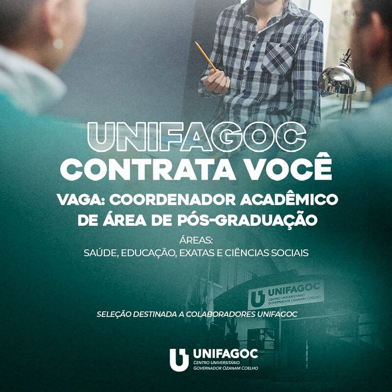 O UNIFAGOC abriu uma seleção de coordenadores para Pós-graduação. As vagas são destinadas a colaboradores que já trabalham na área acadêmica do centro universitário. Serão selecionados profissionais para atuarem nas áreas de Saúde, Educação, Exatas e Ciências Sociais.
