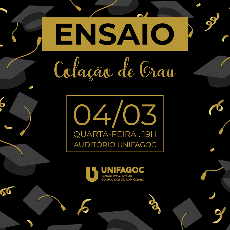 O Centro Universitário UNIFAGOC convoca os formandos de 2019 para o ensaio da Colação de Grau. A atividade irá acontecer no dia 04 de março (quarta-feira), no Auditório Ary Barroso, às 19h. Na oportunidade, serão entregues os convites individuais para a cerimônia de Colação de Grau, que acontece no dsia 13 de março.