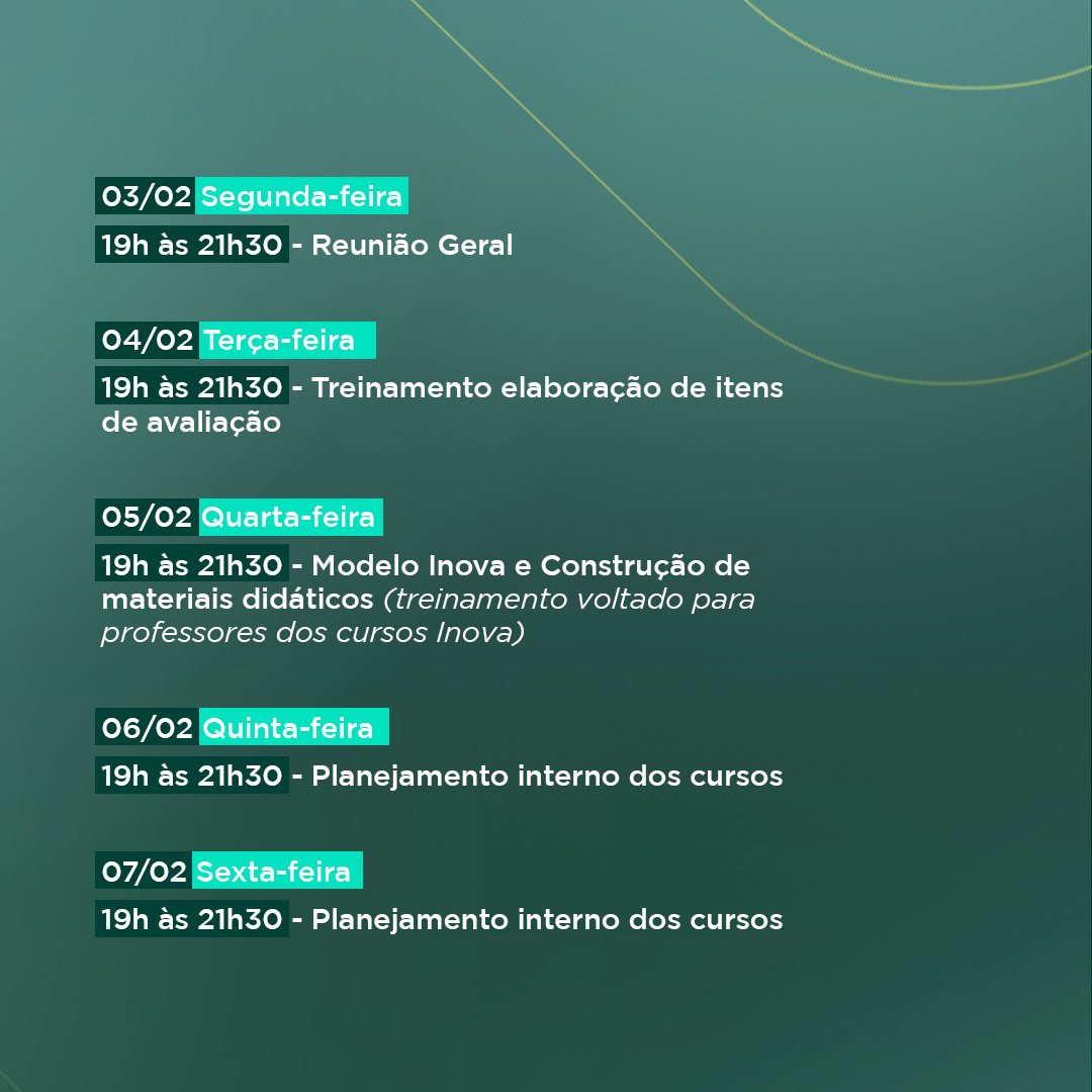 O pró-reitor de graduação da instituição, Leonardo Parma, explica que a programação conta com atividades e treinamentos para uma melhoria contínua e aulas cada vez mais excelentes. Confira abaixo:
