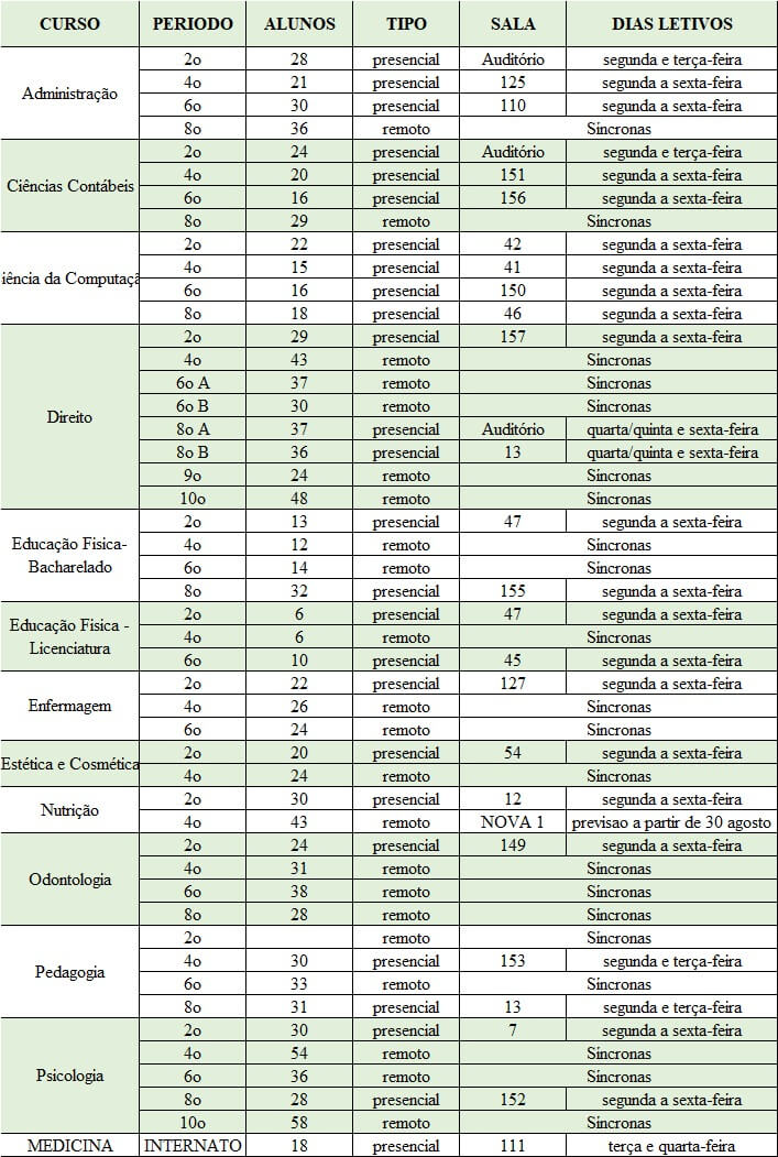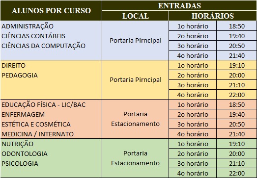 A entrada dos alunos de Administração, Ciência da Computação, Ciências Contábeis, Direito e Pedagogia será pela catraca. Já os alunos de Educação Física, Enfermagem, Estética e Cosmética, Medicina, Nutrição, Odontologia e Psicologia deverão entrar pelo Centro de Triagem localizado no estacionamento de carros do UNIFAGOC.