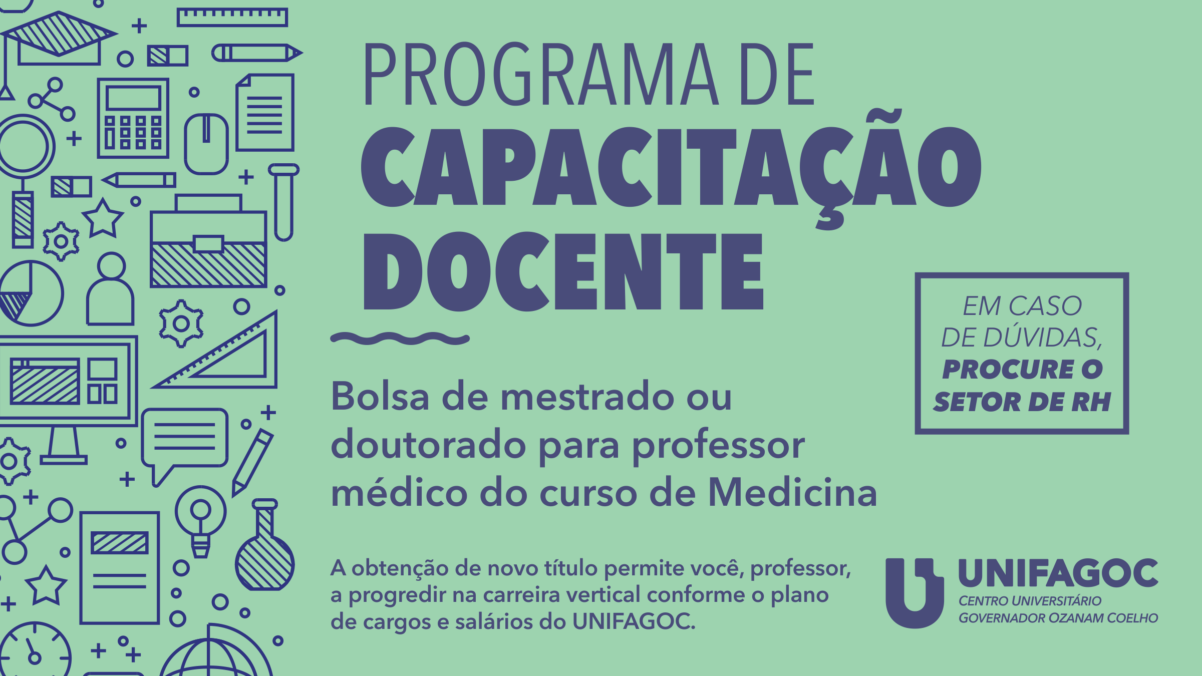 O UNIFAGOC divulga, nesta terça-feira (04), um edital de concessão de bolsa de mestrado ou doutorado destinada aos professores da instituição. Trata-se de um programa de capacitação que visa elevar o grau da formação e desempenho em sala de aula dos docentes. Confira o documento AQUI.