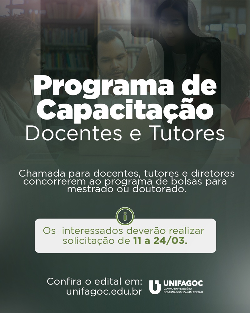 Estão abertas, a partir do dia 11 de março, as inscrições para os professores, tutores e diretores da Instituição participarem do processo de seleção do Programa de Capacitação Docente e Tutores do UNIFAGOC.