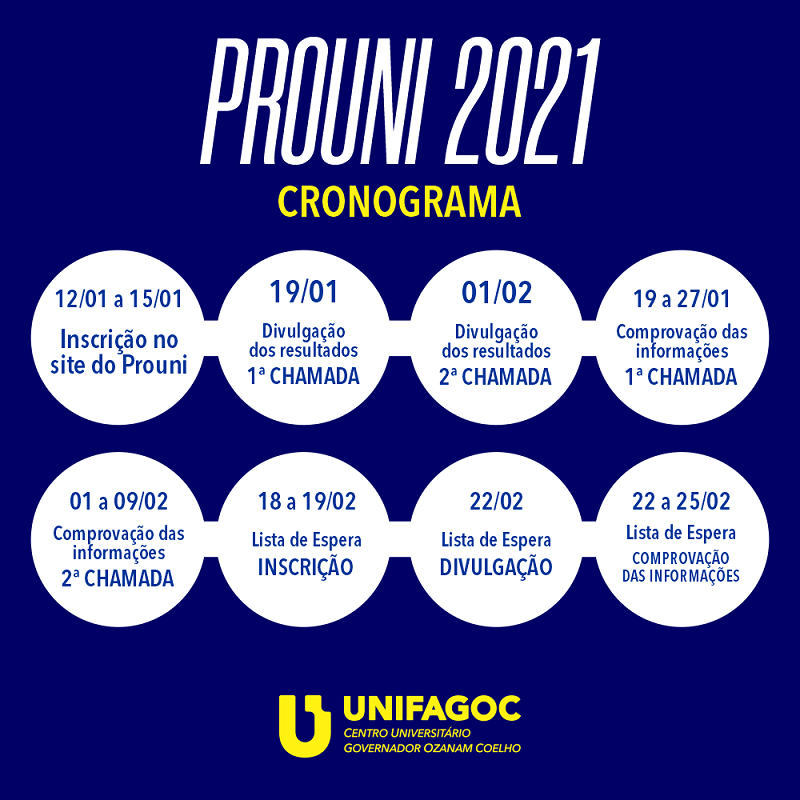 Os candidatos convocados devem se matricular até o dia 27 de janeiro. O procedimento será realizado remotamente, previamente agendado pela Secretaria Acadêmica do UNIFAGOC. Os selecionados devem enviar os documentos (clique aqui) para o e-mail prouni@unifagoc.edu.br, em PDF ou formato de imagem, bem visível, preferencialmente escaneado. No assunto do e-mail, é recomendado inserir o nome do candidato e o curso.