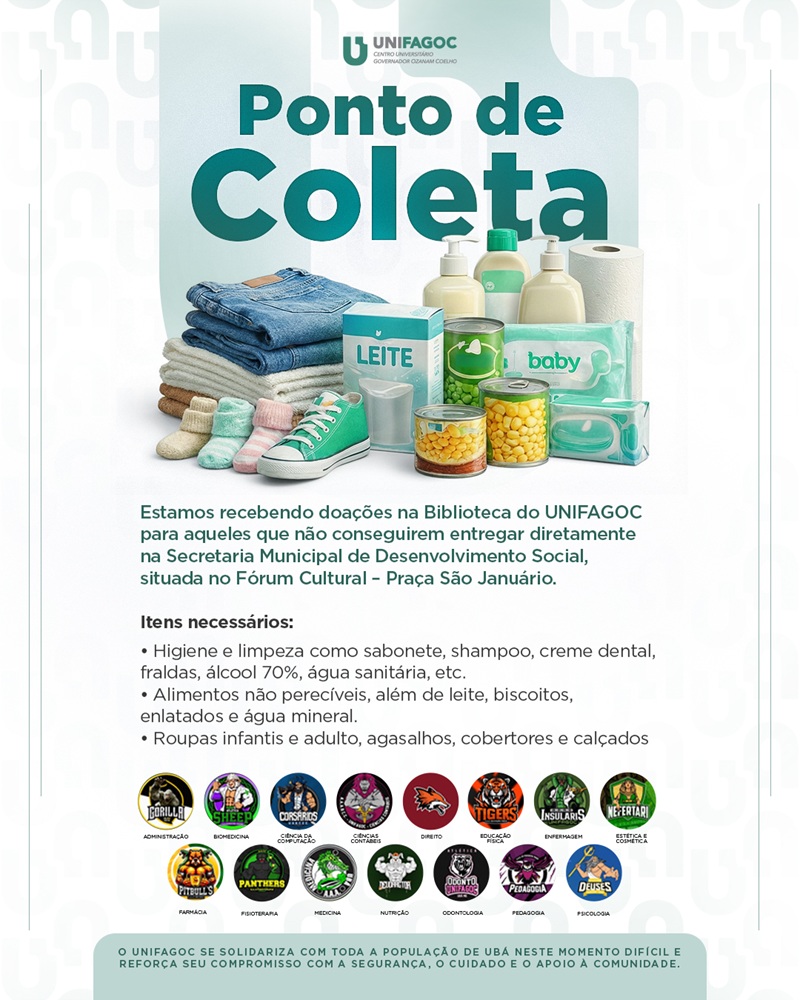 Diante dessa realidade, o UNIFAGOC, em conjunto com as atléticas dos cursos da Instituição, mobiliza sua comunidade acadêmica e se torna ponto oficial de arrecadação de doações para apoiar as famílias atingidas pelas chuvas. A atuação das atléticas reforça o compromisso social dos estudantes e amplia a rede de apoio em favor de Ubá.