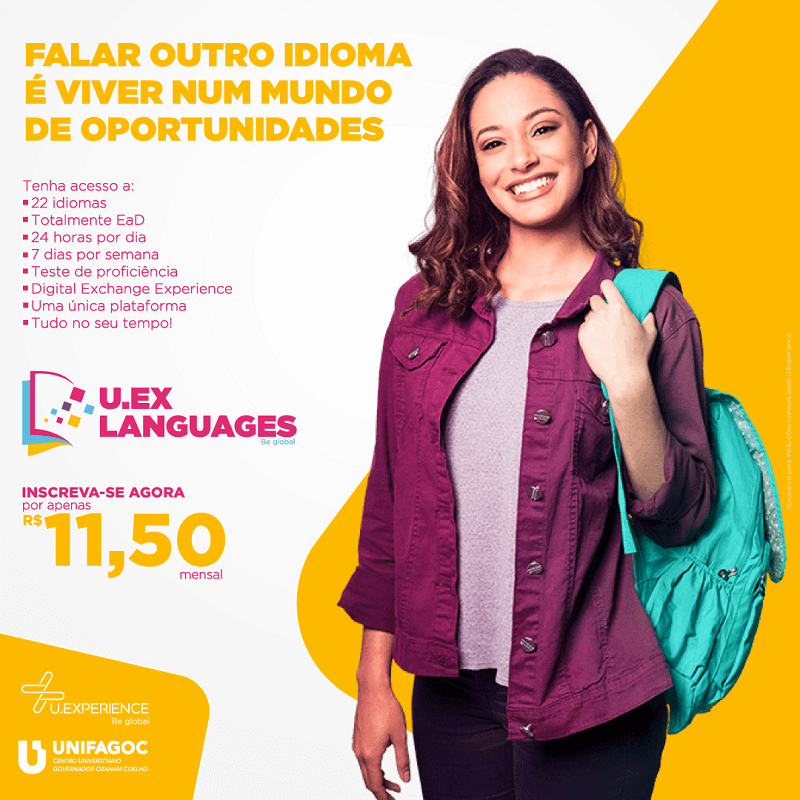 O UNIFAGOC em parceria com a U.Experience – Be Global, empresa de assessoria e consultoria especializada em internacionalização, oferece aos alunos a U.Ex Languages, uma plataforma de ensino de idiomas, que oferece a possibilidade de aprendizado de até 22 idiomas, dentre eles Inglês, Espanhol, Francês, Italiano, Alemão e outros.
