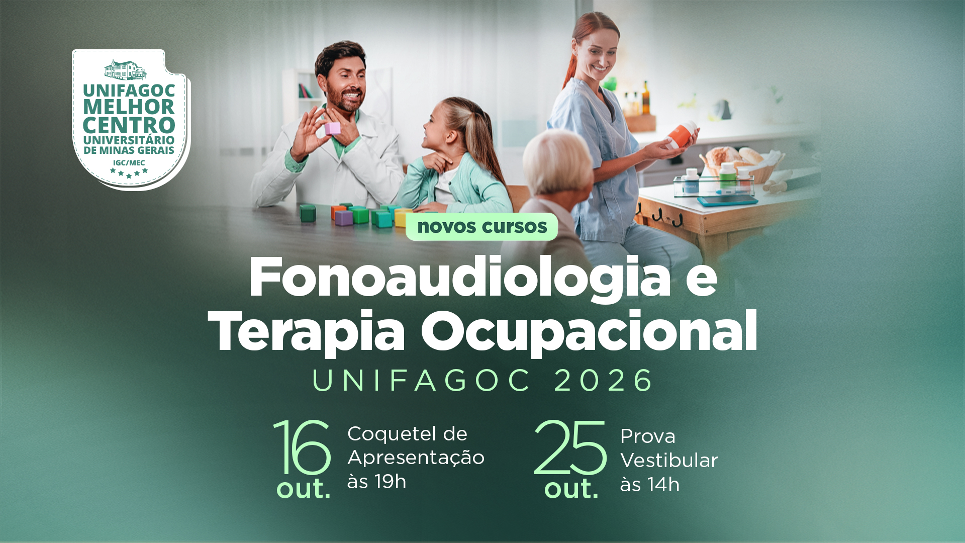 O Centro Universitário Governador Ozanam Coelho, UNIFAGOC, reconhecido como o Melhor de Minas Gerais, dá mais um passo decisivo em seus 26 ANOS DE HISTÓRIA: o lançamento dos cursos de FONOAUDIOLOGIA e TERAPIA OCUPACIONAL.