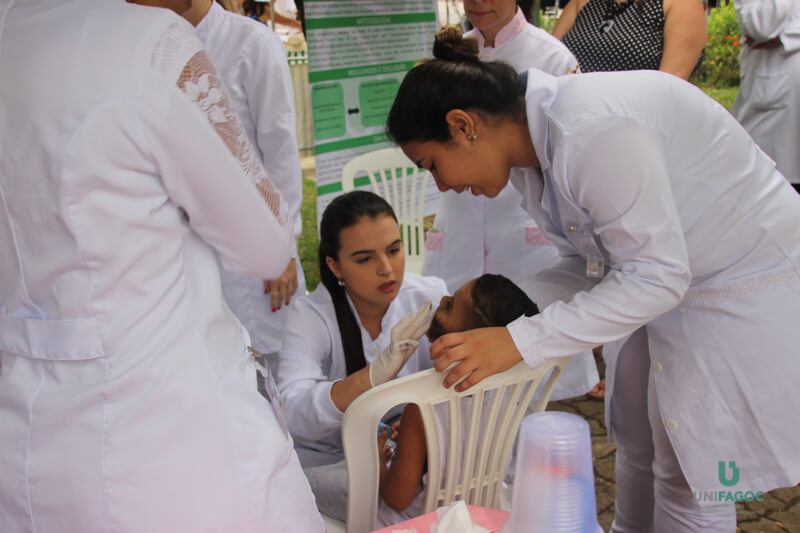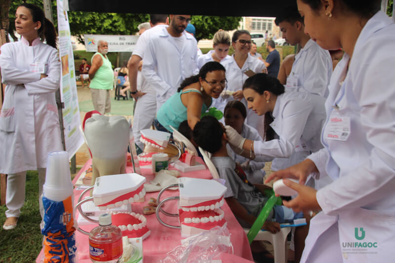 Já os estudantes de Odontologia deram instruções sobre a técnica correta de higiene bucal; orientações de hábitos e dieta saudáveis; tabagismo: implicações na cavidade bucal e repercussões sistêmicas. As alunas de Estética e Cosmética realizaram procedimentos de higienização e hidratação da pele.