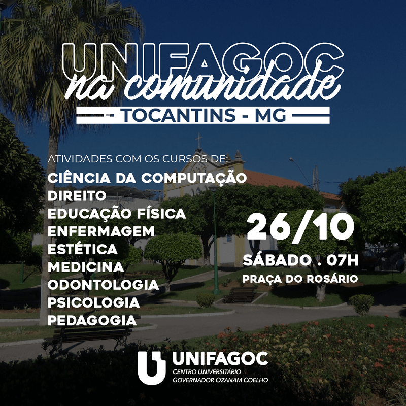 O projeto UNIFAGOC na Comunidade marcará presença no I Fórum de Vivência de Tocantins, neste sábado (26). Na oportunidade, alunos e professores dos cursos de Ciência da Computação, Direito, Educação Física, Enfermagem, Estética e Cosmética, Medicina, Odontologia, Pedagogia e Psicologia do Centro Universitário prestarão serviços gratuitos para os participantes. O evento é aberto à comunidade e acontece a partir das 07h, na Praça do Rosário, no centro da cidade.