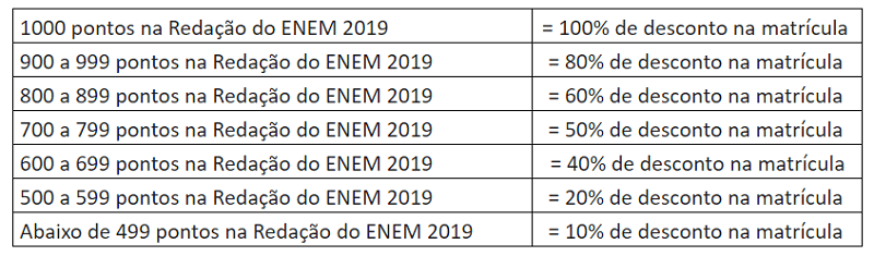 O desconto será concedido mediante comprovação do resultado obtido pelo candidato na edição do Enem de 2019, por meio da apresentação do Boletim Individual, disponibilizado pelo INEP, no ato da matrícula, que deve ser feita na Secretaria Acadêmica, entre os dias 20 e 24 de janeiro, das 09h às 19h.