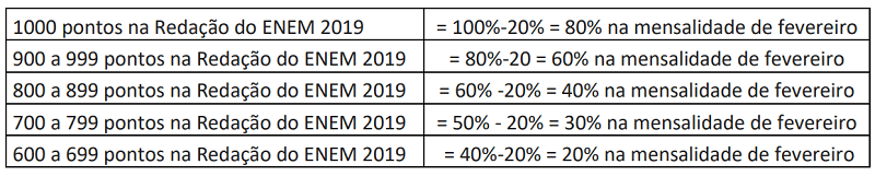 Aos que efetuaram a matrícula entre os dias 25 e 29 de novembro e que obtiveram o desconto de 20% na matrícula, será concedido como desconto, no mês de março, a diferença entre o novo benefício e o desconto ofertado anteriormente, conforme proporcionalidade da sua nota, como consta no REGULAMENTO.