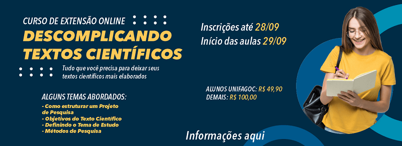 Estão abertas as inscrições para o curso de extensão online Descomplicando Textos Científicos. As aulas serão ministradas pelo professor do UNIFAGOC, doutor Jardel Meirelles e se iniciam no dia 29 de setembro (terça-feira).