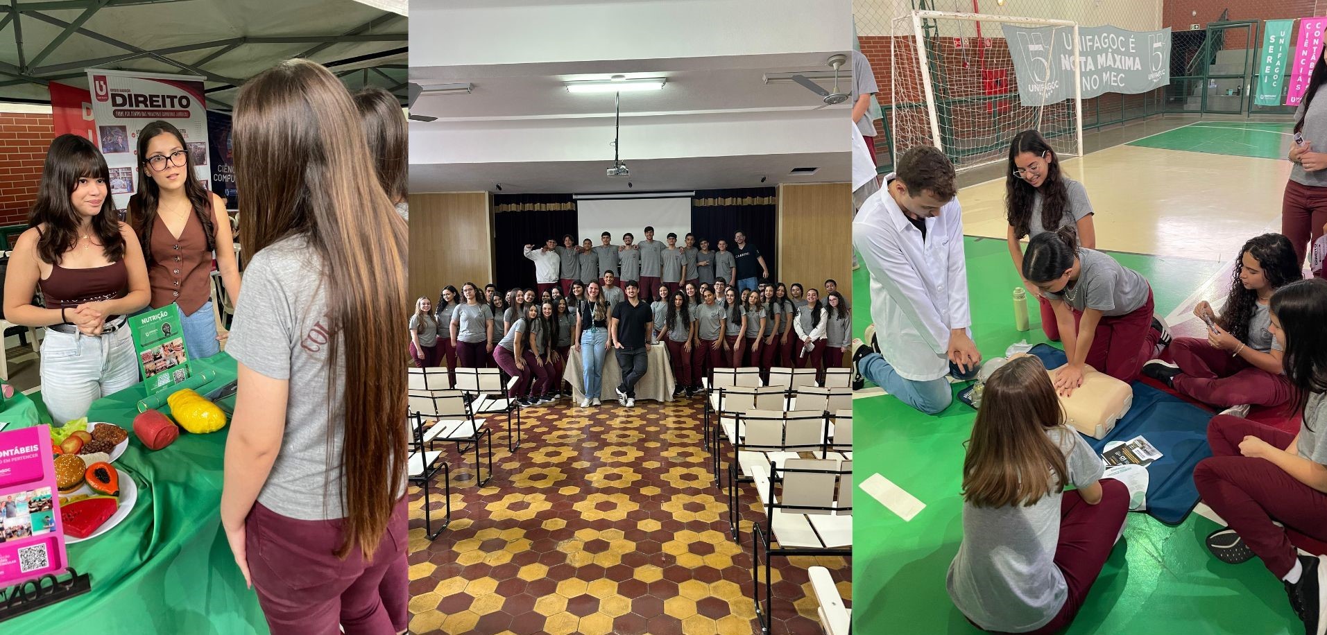Logo após as palestras, os estudantes participaram da Feira de Profissões do UNIFAGOC, onde tiveram a oportunidade de conhecer melhor os cursos de graduação da instituição, conversar com universitários, professores e diretores, além de esclarecer dúvidas sobre as áreas de interesse. A programação contou ainda com atividades interativas, como um quiz com brindes, a distribuição de picolés e a interação com a comunidade acadêmica, tornando a experiência ainda mais dinâmica e enriquecedora.