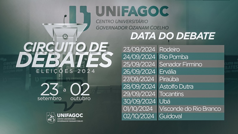 Em 2024, o Centro Universitário Governador Ozanam Coelho – UNIFAGOC reafirma seu compromisso com a promoção da democracia ao sediar a 2ª edição do Circuito de Debates Eleitorais. De 23 de setembro a 2 de outubro, o evento reunirá candidatos e candidatas às prefeituras de Ubá e região, oferecendo à população oportunidade única para conhecer e avaliar as propostas dos futuros gestores públicos.