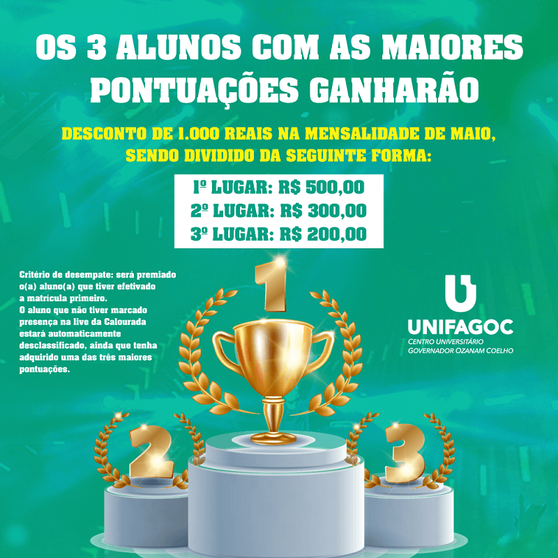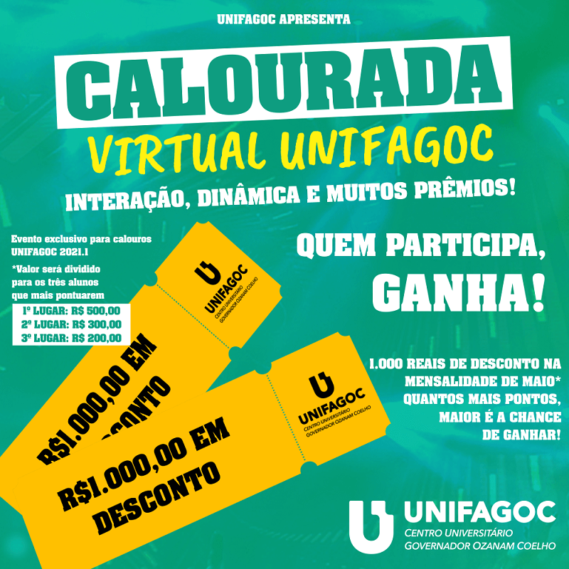 Durante o evento online, os alunos poderão participar de dinâmicas e brincadeiras, além de concorrerem a sorteios de prêmios oferecidos pelo UNIFAGOC e brindes das Atléticas de alguns cursos. E para ficar ainda melhor, o Centro Universitário premiará com R$ 1.000,00 de desconto na mensalidade do mês de maio os três alunos mais engajados e que mais pontuarem nas ações abaixo, sendo o valor supracitado dividido para os vencedores da seguinte forma: