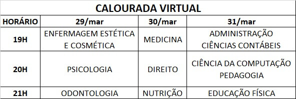 O evento de boas-vindas aos novos alunos do UNIFAGOC será realizado na próxima semana, entre os dias 29 e 31 de março, na Calourada Virtual. Promovida pela instituição em parceria com as Atléticas dos cursos, a iniciativa busca aproximar e integrar os calouros, bem como promover momentos de descontração e alegria em tempos de pandemia.