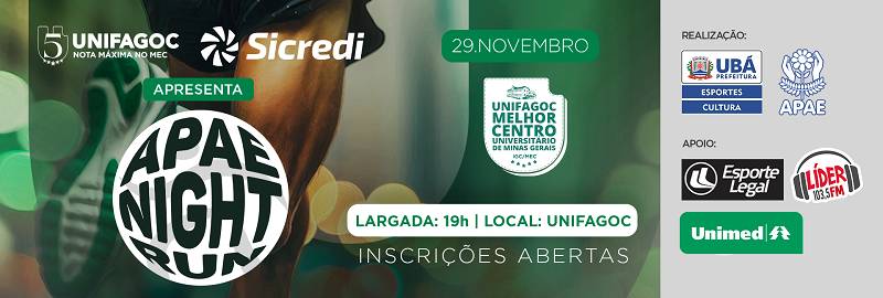 No dia 29 de novembro acontecerá a corrida rústica APAE Night Run 2025, evento realizado pela Apae Ubá que conta com a promoção do UNIFAGOC em parceria com a Prefeitura Municipal de Ubá/Secretaria Municipal de Cultura, Turismo e Lazer por meio da sua Divisão de Esportes e Juventude e Sicred; e apoio da Esporte Legal, Unimed e Rádio Líder FM 103,5.