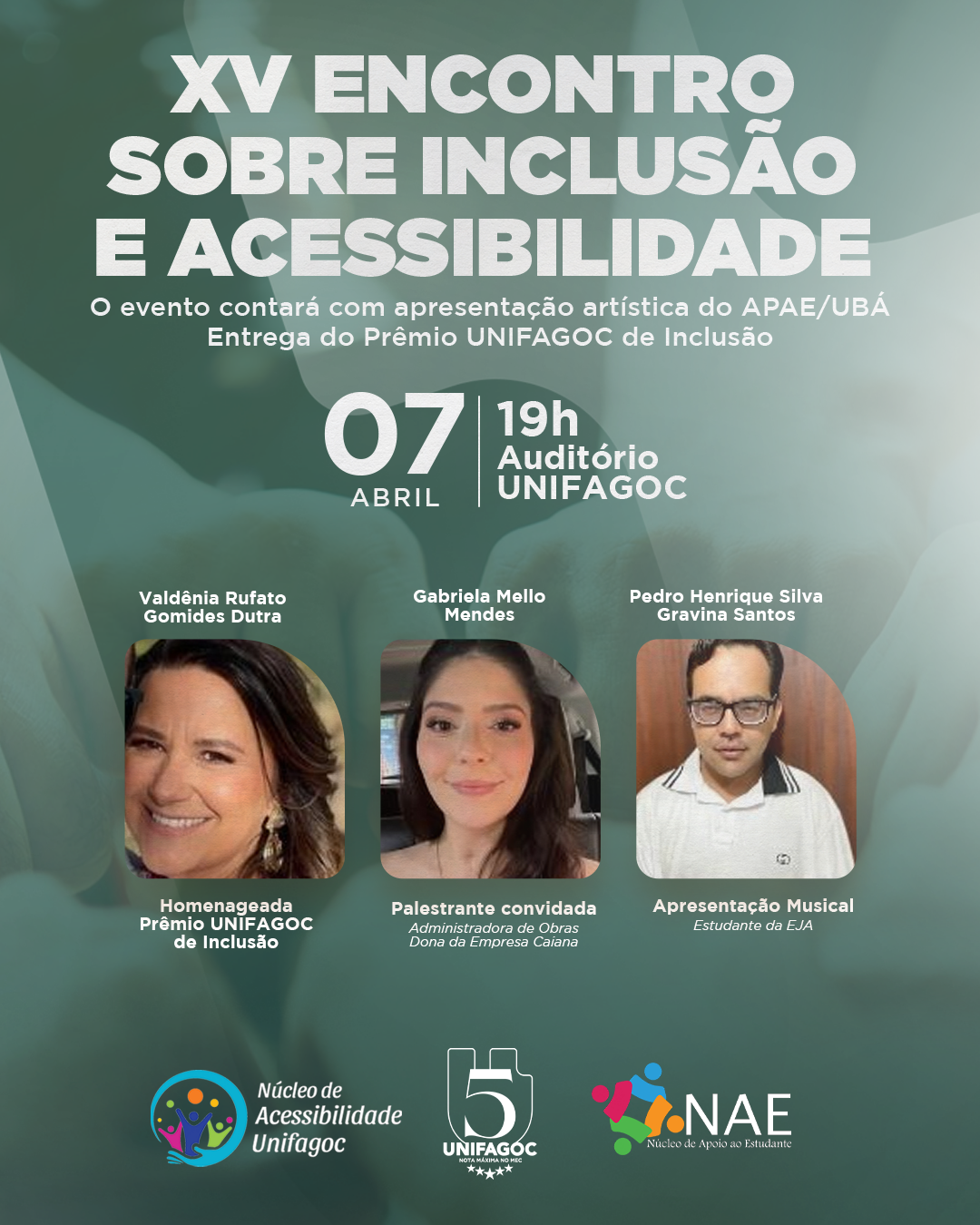 O UNIFAGOC, por meio dos Núcleos de Acessibilidade e de Apoio ao Estudante, promove a XV edição do Encontro de Inclusão e Acessibilidade. A iniciativa, que é realizada semestralmente na instituição, acontecerá no dia 07 de abril (segunda-feira), no auditório Ary Barroso, às 19h.