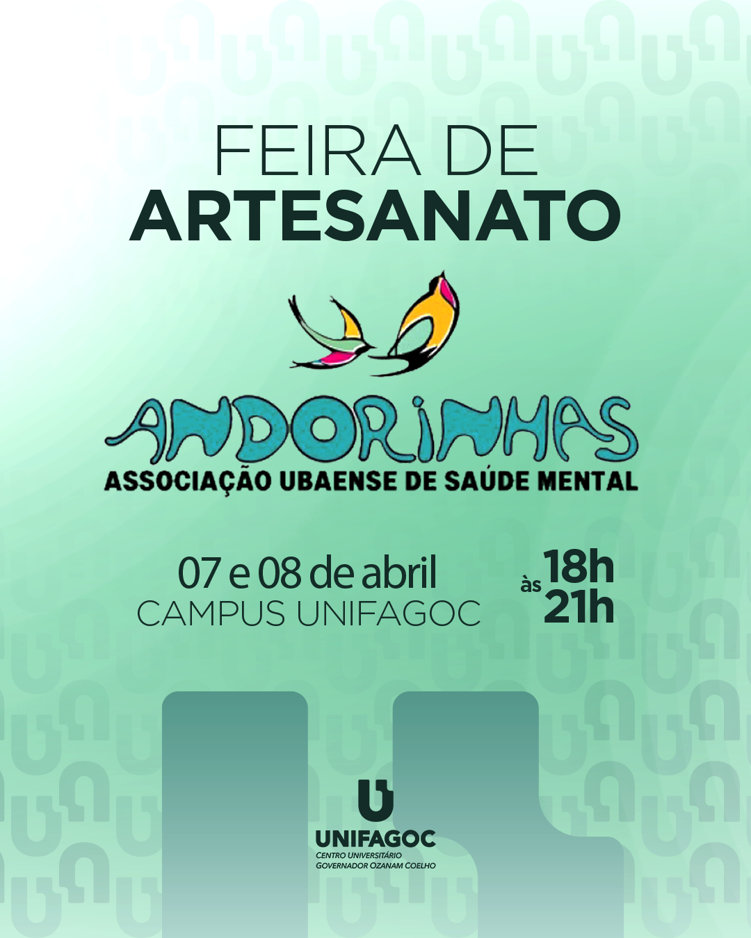 Nos dias 07 e 08 de abril, terça e quarta-feira, o UNIFAGOC será sede de mais uma edição da tradicional Feira de Artesanato promovida pela Associação Ubaense de Saúde Mental – Artes e Culturas (ANDORINHAS). A iniciativa será aberta à visitação de alunos e colaboradores da Instituição.