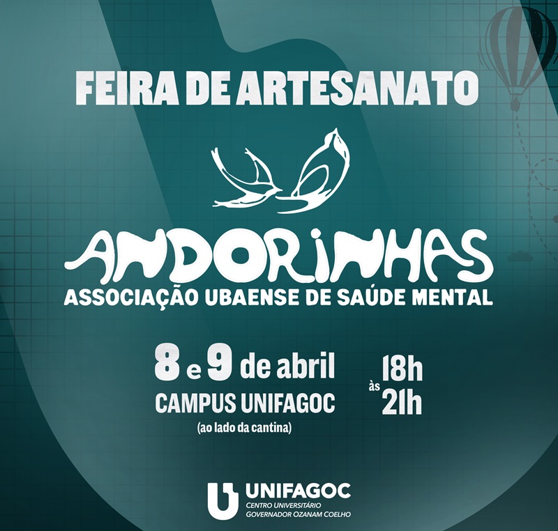 Nos dias 08 e 09 de abril, segunda e terça-feira, o UNIFAGOC será sede de mais uma Feira de Artesanatos da Associação Ubaense de Saúde Mental – Artes e Culturas (ANDORINHAS). A iniciativa será aberta para a visitação dos alunos e colaboradores do Centro Universitário.