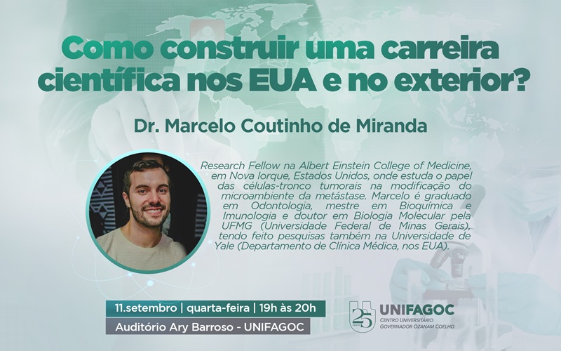 O UNIFAGOC convida toda a comunidade acadêmica e interessados para a palestra “Como construir uma carreira científica nos EUA e no exterior?“, que será realizada no dia 11 de setembro, quarta-feira, das 19h às 20h, no Auditório Ary Barroso, campus da Instituição, conduzida pelo Dr. Marcelo Coutinho de Miranda.