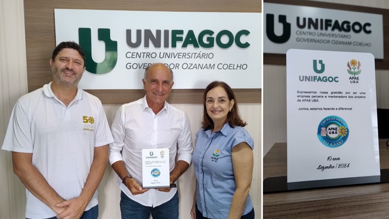 A placa foi entregue ao Reitor do UNIFAGOC, Dr. Ricardo Belo Couto pela diretora da APAE Ubá, Rosane Soldati da Cruz e o gerente administrativo Artur Fernandes de Freitas. Em nota, a diretoria diz que essa é uma demonstração da profunda gratidão da família apaeana pela parceria com o Centro Universitário.