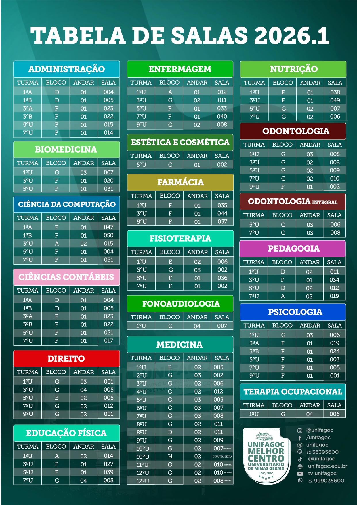 Dentro dos blocos, as salas seguem uma numeração em ordem crescente, sempre iniciando pelo número 01. Ao entrar no prédio, a própria sequência numérica conduz o deslocamento pelos setores e ambientes, tornando o trajeto mais intuitivo. A lógica também se mantém nos diferentes andares: bloco, andar e número da sala passam a ser os principais referenciais de localização.