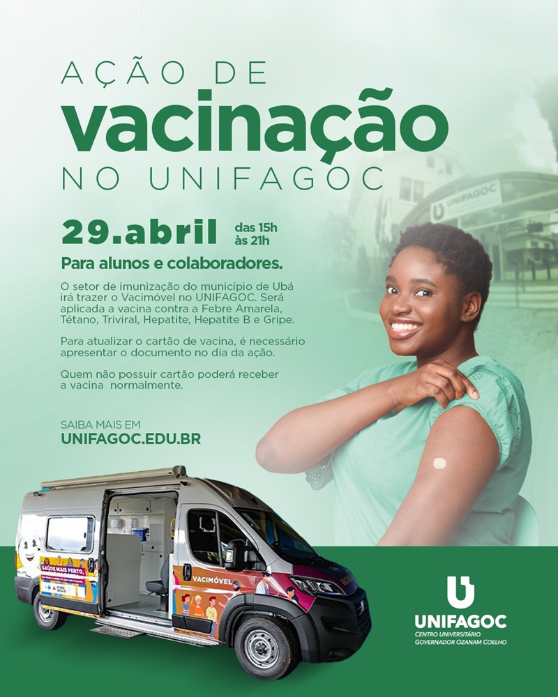 No dia 29 de abril (quarta-feira), das 15h às 21h, o Vacimóvel da Prefeitura de Ubá estará no campus do UNIFAGOC para aplicar a vacina contra a Febre Amarela, Tétano, Triviral, Hepatite, Hepatite B e Gripe para alunos e colaboradores.