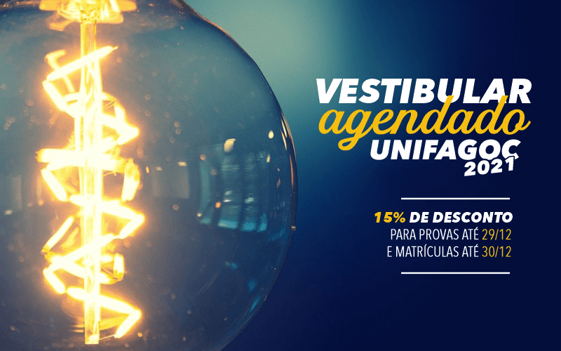 O UNIFAGOC oferece mais uma chance para quem ainda não realizou o Vestibular para ingresso no primeiro semestre de 2021. O candidato que fizer a prova online até dia 29 de dezembro ou usar a nota do ENEM e se matricular até o dia 30 de dezembro, terá 20% de desconto na matrícula. Confira o regulamento AQUI.
