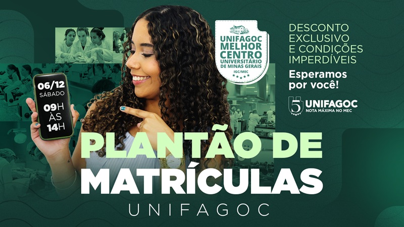 Venha garantir sua vaga no Melhor Centro Universitário de Minas Gerais no primeiro semestre de 2026 com descontos imperdíveis! Neste sábado, 6 de dezembro, das 09h às 14h, o UNIFAGOC realiza o Plantão de Matrículas. Aproveite essa oportunidade para começar o ensino superior e se matricular com condição especial.