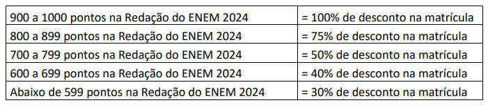Ganhe até 100% de desconto na matrícula utilizando sua nota da redação do Enem 2024 por meio do Programa Desconto Especial UNIFAGOC pelo ENEM. Confira abaixo a tabela com a porcentagem de desconto: