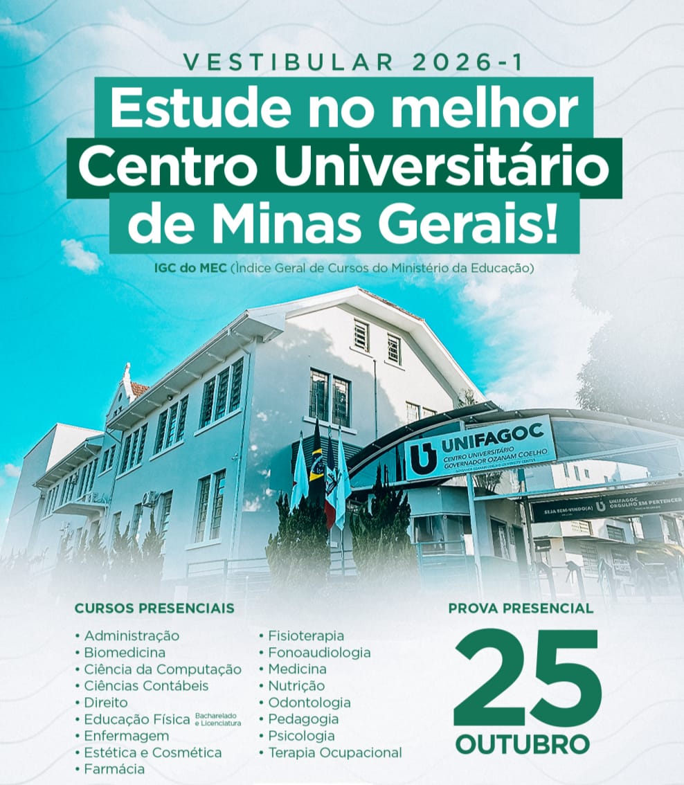 Vestibular UNIFAGOC 2026-1 está com inscrições abertas: prova ocorrerá em 25 de outubro; Estude na MELHOR DE MINAS