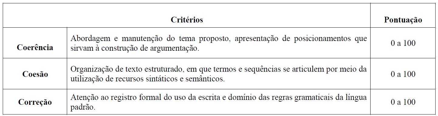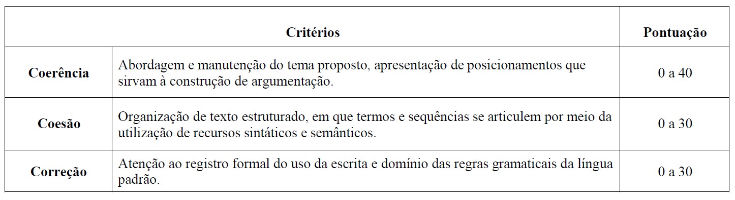 A prova de redação tem por objetivo verificar a clareza e a correção textual, a adequada organização de ideias, a capacidade de argumentação, assim como a coesão e a coerência. Esta será valorizada em 100 pontos, assim distribuídos: